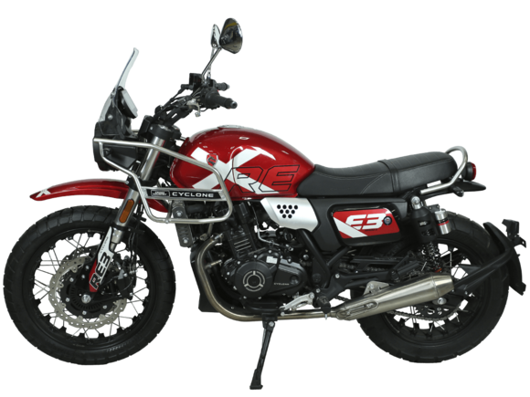 CYCLONE RE3 Scrambler (SR400-A) – универсальный мотоцикл, объединяющий в себе черты городского мотоцикла и эндуро. Управляя им, можно бросить вызов и городским пробкам, и скоростным автострадам, и всевозможному лёгкому бездорожью. Его дизайн отдаёт дань уважения каферейсерской тематике.Двухцилиндровый четырёхтактный двигатель объёмом 401 см3 выдаёт 43 л.с. на 9500 об/мин. Инжекторный впрыск топлива с инжектором BOSCH увеличивает топливную экономичность, а также позволяет добиться высокой приёмистости и неприхотливости агрегата. Жидкостная система охлаждения не допустит перегрева двигателя даже при самом агрессивном вождении. На мотоцикл установлена 6-ступенчатая механическая коробка передач.Максимальная скорость мотоцикла составляет 140 км/ч.Мотоцикл оснащён классическими спицованными колёсами диаметром 17 и 19 дюймов и имеет достаточно большой дорожный просвет – 22 см. С неровностями дороги эффективно справляются телескопическая вилка перевёрнутого типа спереди и маятник с двумя амортизаторами сзади. Ход передней подвески составляет 130 мм, задней – 81 мм. Оба компонента подвески являются регулируемыми. Эффективное и безопасное замедление с любых скоростей обеспечивают гидравлические дисковые тормоза с ABS спереди и сзади.Клиренс мотоцикла составляет 220 мм. Объём топливного бака – 19 л. Снаряжённая масса – 200 кг.На данной модели штатно установлены дуги безопасности, а также имеется бортовой компьютер с цветным дисплеем, USB-порт и подсветка пультов.RE3 Scrambler сочетает в себе отличные технические характеристики, комфорт и надёжность, что позволяет вам ощутить настоящую свободу на любой дороге с любым покрытием.
