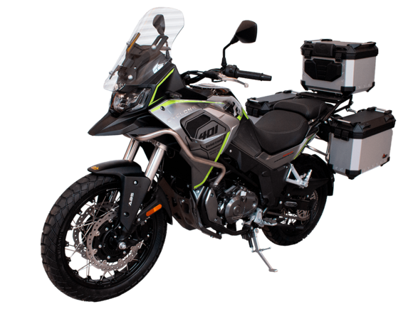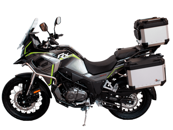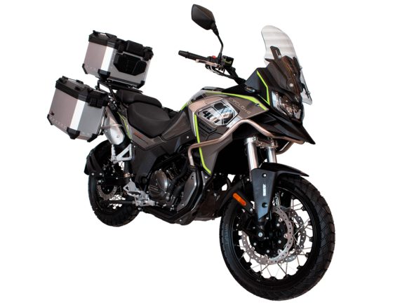 Мотоцикл CYCLONE RX600 ADV 2025 ПТС – туристический эндуро для покорения самых непростых и протяжённых маршрутов.Силовая установка представлена 2-цилиндровым 4-тактным двигателем DOHC объёмом 550 см³ с 4 клапанами на каждом цилиндре. Мощность в 59,9 л.с. достигается при 8500 об/мин, а максимальный крутящий момент 55 Н·м при 6500 об/мин. Соотношение диаметра цилиндра и хода поршня 72х67,6 мм. Степень сжатия 11:1. Жидкостная система охлаждения не допустит перегрева двигателя даже на самых непростых маршрутах. Механическая коробка передач имеет 6 ступеней.Максимальная скорость 170 км/ч.Объём топливного бака 18 литров.На мотоцикл установлены спицованные алюминиевые колёса диаметром 19 дюймов спереди и 17 дюймов сзади. В качестве передней подвески используется телескопическая вилка перевёрнутого типа с ходом 130 мм, а задней – маятник с моноамортизатором с ходом 55 мм. Оба компонента подвески регулируются. На переднее колесо установлены 2 тормозных диска диаметром 305 мм с 4-поршневыми суппортами, а сзади используется тормозной диск 258 мм с однопоршневым суппортом с плавающей скобой. Дополнительно на оба колеса установлена настраиваемая ABS-система.Габариты мотоцикла 2160х870х1399 мм, вес 219 кг. Клиренс 175 мм, колёсная база 1410 мм, высота по седлу 810 мм.Оснащён противобуксовочной системой и датчиками давления в шинах. Для освещения используется диодная светотехника. Многофункциональная приборная панель имеет TFT-дисплей. На руле установлена подсветка пультов. Для зарядки устройств имеется USB-порт. Также есть защитные дуги, защита двигателя, 3 кофра и центральная подставка.