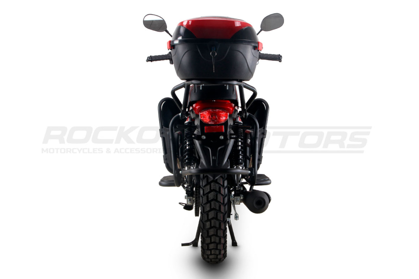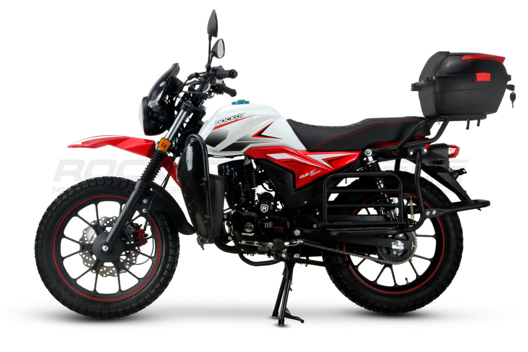 ROCKOT QUEST 150 - новый, дорожный мотоцикл от компании ROCKOT-MOTORS, с большим потенциалом на длительные поездки, независимо от типа дорожного покрытия. Благодаря своим компактным размерам, короткой колесной базе, мотоцикл отлично чувствует себя в городской среде с большим объемом дорожного трафика. Максимальная скорость ROCKOT QUEST 150 - до 92 км/ч на стандартных приводных звездах. Масса мотоцикла -126 килограмм, но при небольшой высоте по седлу в 820 мм и низкому центру тяжести, он ощущается достаточно легким.Мотоцикл имеет ЭПТС, оснащен цветной электронной панелью приборов, зеркалами, всей необходимой светотехникой, что позволяет законно передвигаться по дорогам общего пользования. ДизайнМотоцикл построен в классическом исполнении, но имеет множество современных, технологичных решений.Все световые приборы - светодиодные и очень яркие. Передняя фара имеет круглую классическую форму, но стоит ее включить, как мотоцикл обретает совершенно другой вид.Цветовая гамма модели имеет три варианта окраски: бело-красный, черный и серый.Конечно же, бросается в глаза оснащение мотоцикла туристической багажной системой. На заднем багажнике установлен жесткий центральный кофр. Откидные боковые багажники, позволяют перевозить объемный груз, а также устанавливать боковые багажные сумки. Глядя на мотоцикл, складывается впечатление, что все его пространство использовано максимально практично. Даже в дугах безопасности встроены дополнительные багажные карманы.Топливная системаВ основе топливной системы ROCKOT QUEST 150 - большой топливный бак объемом 12 литров. В зависимости от условий эксплуатации и стиля езды, расход топлива варьируется в районе 3-3,5 литров на 100 километров. Это позволяет преодолевать большие расстояния на одном баке бензина. Используемый тип топлива - бензин АИ-92. Образует топливную смесь - карбюратор PZ27 с ускорительным насосом. Ускорительный насос исключает момент “провала” при резком открытии дроссельной заслонки.Тормозная системаПо канонам классического мотоциклостроения, ROCKOT QUEST 150 имеет комбинированную тормозную систему. Спереди установлен дисковый гидравлический тормоз, с двухпоршневым суппортом, яркого красного цвета. Задний тормоз - механический, барабанный.Кому подойдет ROCKOT QUEST 150Мотоцикл будет очень полезен новичкам. Его небольшие габаритные размеры, низкий центр тяжести, малая высота по седлу - позволяют быстро освоить технику управления мотоциклом как в условиях города, так и бездорожья. С практичной точки зрения, мотоцикл понравится любителям выезжать на отдых за город. Отличная туристическая подготовка, позволит перевозить все, что Вам может потребоваться во время отдыха.Благодаря заложенной надежности в конструкцию двигателя и мотоцикла - ROCKOT QUEST 150 оценит старшее поколение, для кого требуется простая и надежная техника..