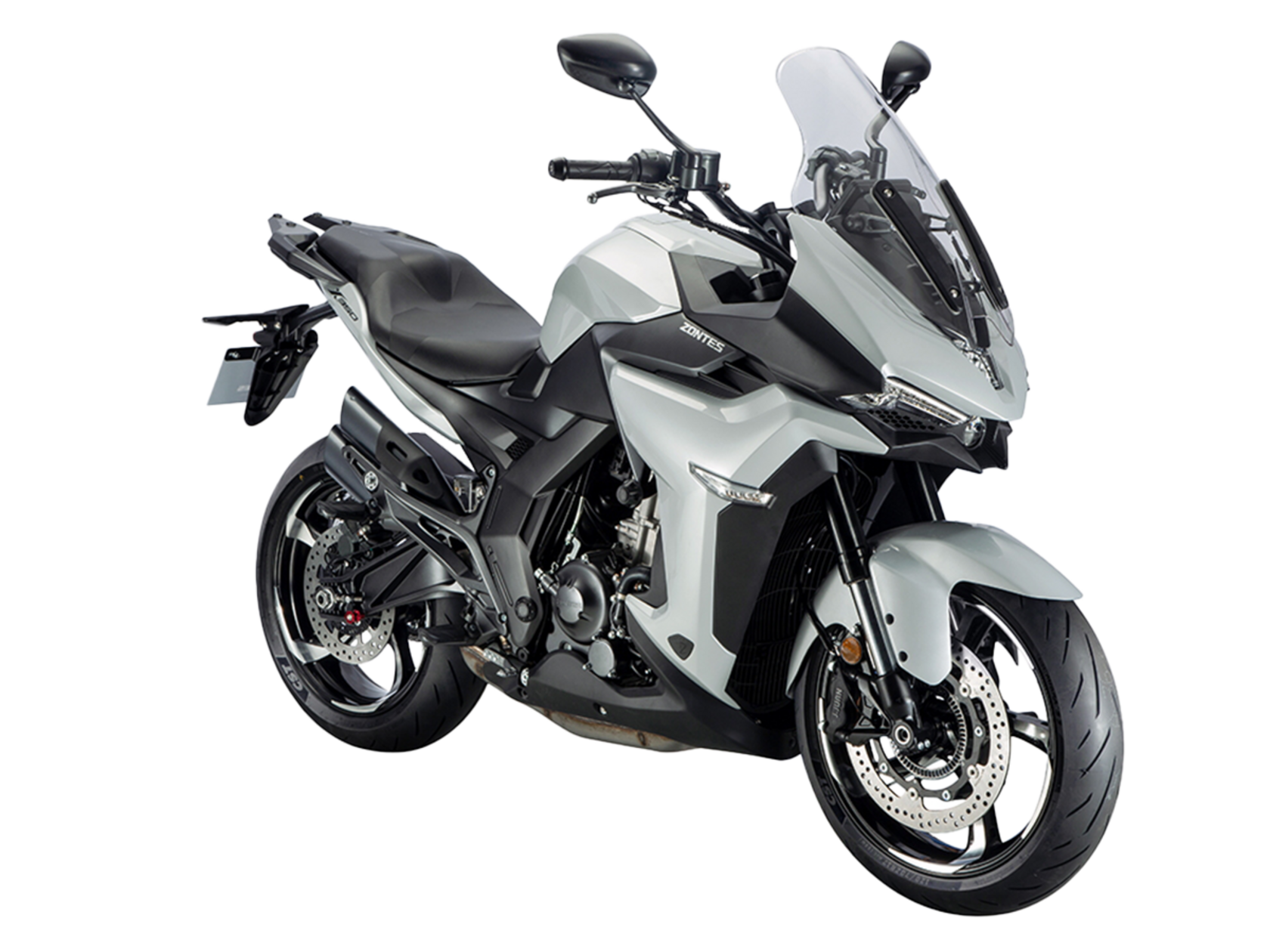 Мотоцикл ZONTES ZT350-X – турист со стремительным современным дизайном. Хорошо подходит как для повседневных поездок по городу, так и для покорения дальних маршрутов.Силовая установка представлена одноцилиндровым 4-тактным двигателем ZT184MP с 4 клапанами и 2 верхними распредвалами. Двигатель имеет объём 348 см³ и обеспечивает мощность в 39 л.с. Оснащён инжектором BOSCH и системой жидкостного охлаждения. Механическая коробка передач имеет 6 ступеней и схему 1-N-2-3-4-5-6. Запуск двигателя осуществляется с помощью бесключевого доступа.Ёмкость топливного бака 19 литров.Колёса представлены литыми алюминиевыми дисками диаметром 17 дюймов. На мотоцикл установлены датчики давления в шинах, показатели от которых выводятся на приборную панель. Для подвески спереди используется телескопическая вилка, сзади – моноамортизатор. Гидравлические дисковые тормоза произведены испанской компанией J.JUAN, входящей в холдинг BREMBO.Для освещения используется яркая LED-оптика, а приборная панель представлена цифровым дисплеем. Имеется 2 USB-порта.Габариты мотоцикла 2055х795х1330 мм. Колёсная база 1380 мм. Высота по седлу 795 мм. Вес 169 кг.