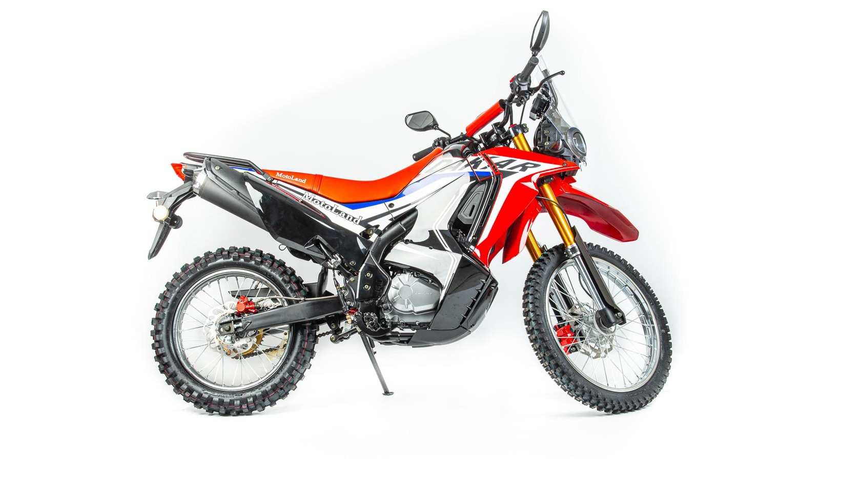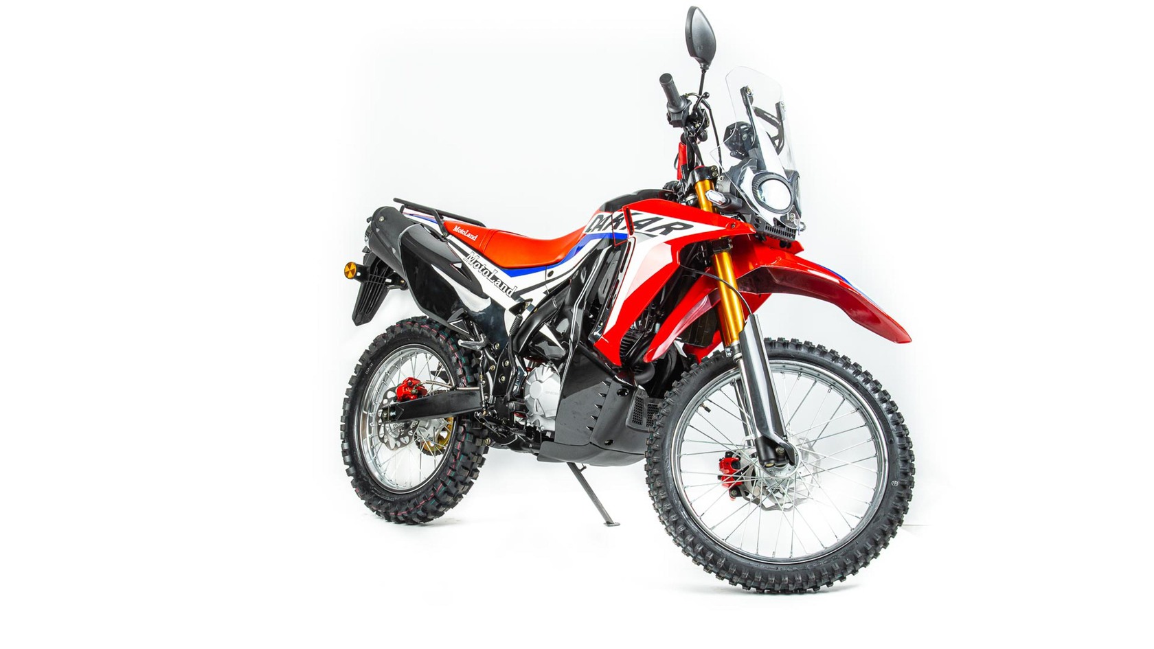 Новинка 2020 года - Мотоцикл Motoland DAKAR 250 ST.Данный мотоцикл прост в управлении и неприхотлив в обслуживании и подходит мотолюбителям Эндуро любого возраста,и опыта вождения, которым нужна техника для поездок из точки А в точку Б и обратно по дорогам и легкому бездорожью.Motoland DAKAR 250 ST оснащен одноцилиндровым четырехтактным двигателем 172FMM мощностью 21 л. с. и объемом 250 см³ с воздушным охлаждением. Установлен карбюратор PZ 30 с ускорительным насосом увеличивает скорость разгона.Для запуска двигателя можно использовать электростартер или кикстартер.Механическая трансмиссия содержит 5 передач.Мотоцикл оснащен надежными передними и задними тормозами с двух поршневыми тормозными суппортами.Колёса спицованные, размер заднего колеса — 18 дюймов, переднего — 21 дюйм. Весит 120 кг, выдерживает нагрузку до 150 кг.У нас Вы можете купить этот мотоцикл с бесплатной доставкой по РФ и гарантией до года. Также его можно приобрести в рассрочку или в кредит.