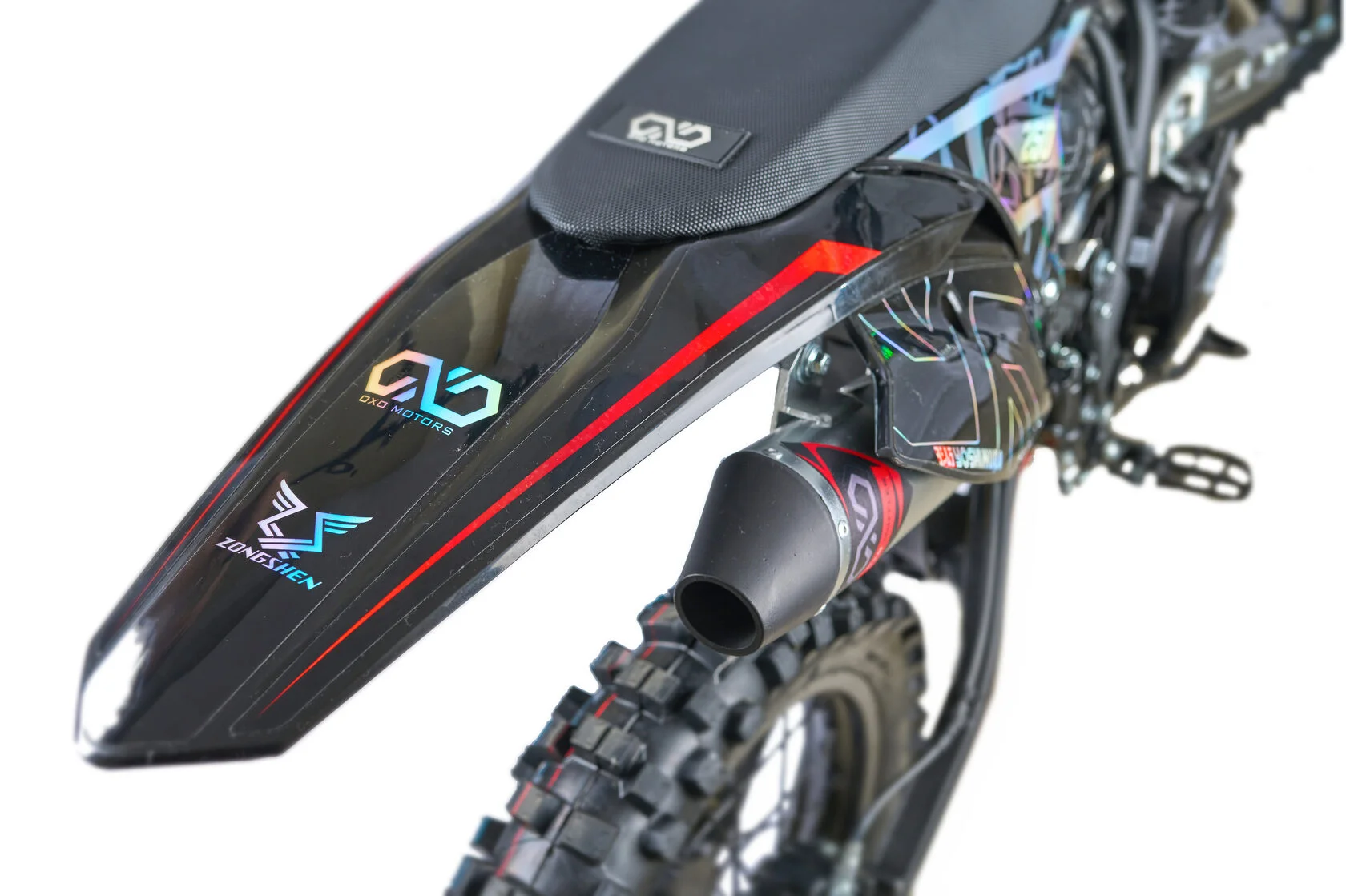 ДвигательМодель оснащена двигателем Zongshen 172FMM-3A с пятиступенчатой КПП. Особенностью двигателя, можно считать то, что данный двигатель является самым надежным среди серии моторов Zongshen.РамаРама мотоцикла OXO производится из труб шестигранного сечения хром-молибденовой стали, которая является очень прочной и легкой. Геометрия рамы, благодаря правильно выверенному центру тяжести и углу наклона вилки - способствует наилучшей управляемости устойчивости мотоцикла на низкой скорости.ПодвескаПередняя вилка перевернутого типа. Мотоцикл снабжен моноамортизатором, который соединен посредством системы рычагов прогрессии. Система прогрессии, обеспечивает равномерную, мягкую работу и увеличивает длину рабочего хода подвески.КолесаВ переднем и заднем колесах установлены антибуксаторы, которые притягивают покрышку к ободу, позволяя ездить по бездорожью при низком давлении в камерах, не давая покрышке проворачиваться во время езды. Размер передней покрышки: 80/100-21. Размер задней покрышки: 120/100-18. Они прекрасно себя ведут по песку и грязи, что позволяет райдеру отлично показать себя на пересеченной местности.Тормозная системаТормозная система мотоцикла - полностью гидравлическая с армированными шлангами. Спереди и сзади установлен двухпоршневой суппорт. Данная конфигурация тормозных механизмов, позволит быстро и безопасно остановиться с максимальной скорости даже на бездорожье.РульВажная часть современного эндуро мотоцикла - усиленный руль переменного сечения. На руле установлен рычаг заслонки подсоса. Алюминиевая ручка газа с коротким ходом имеет регулировку троса.