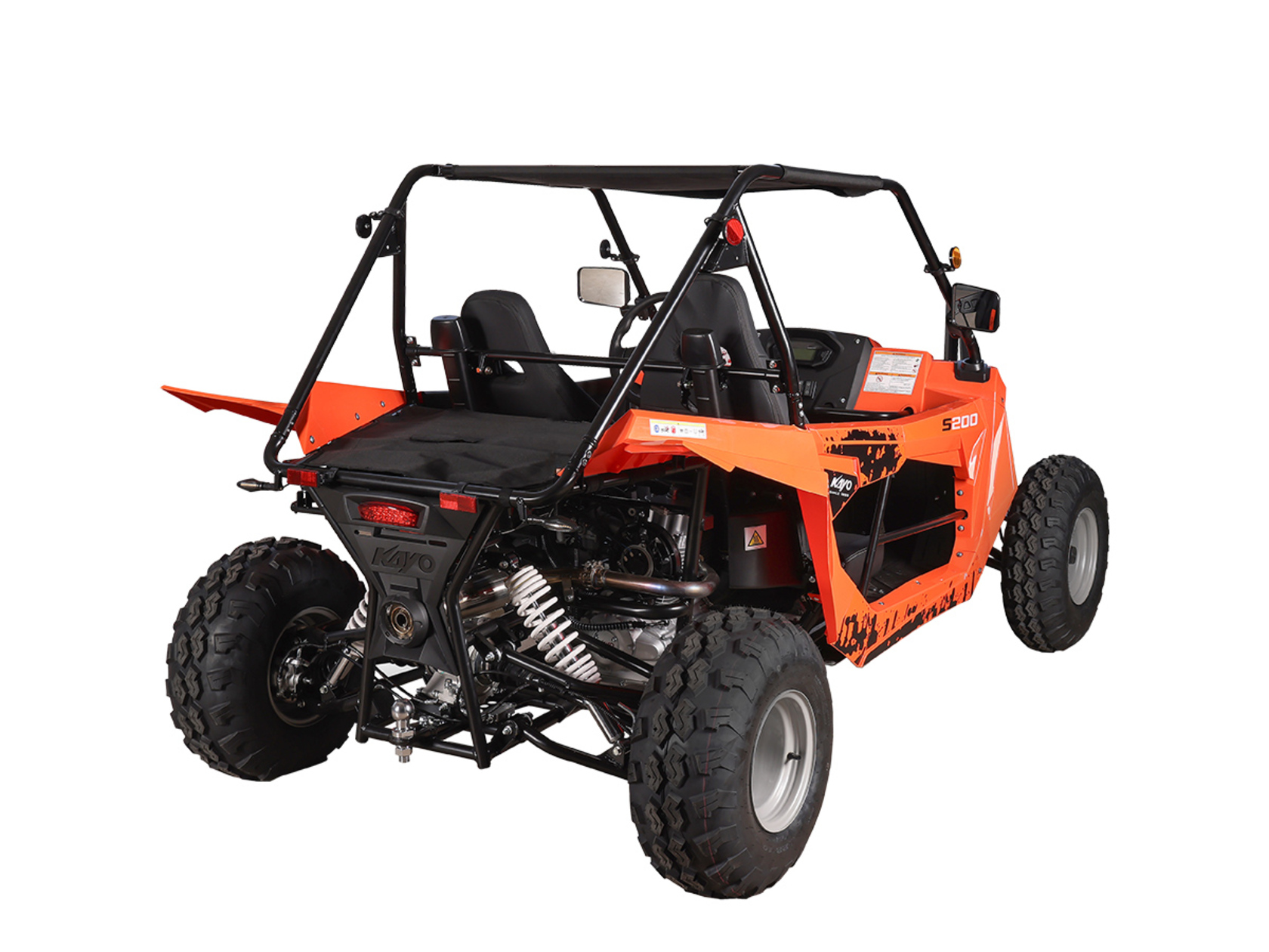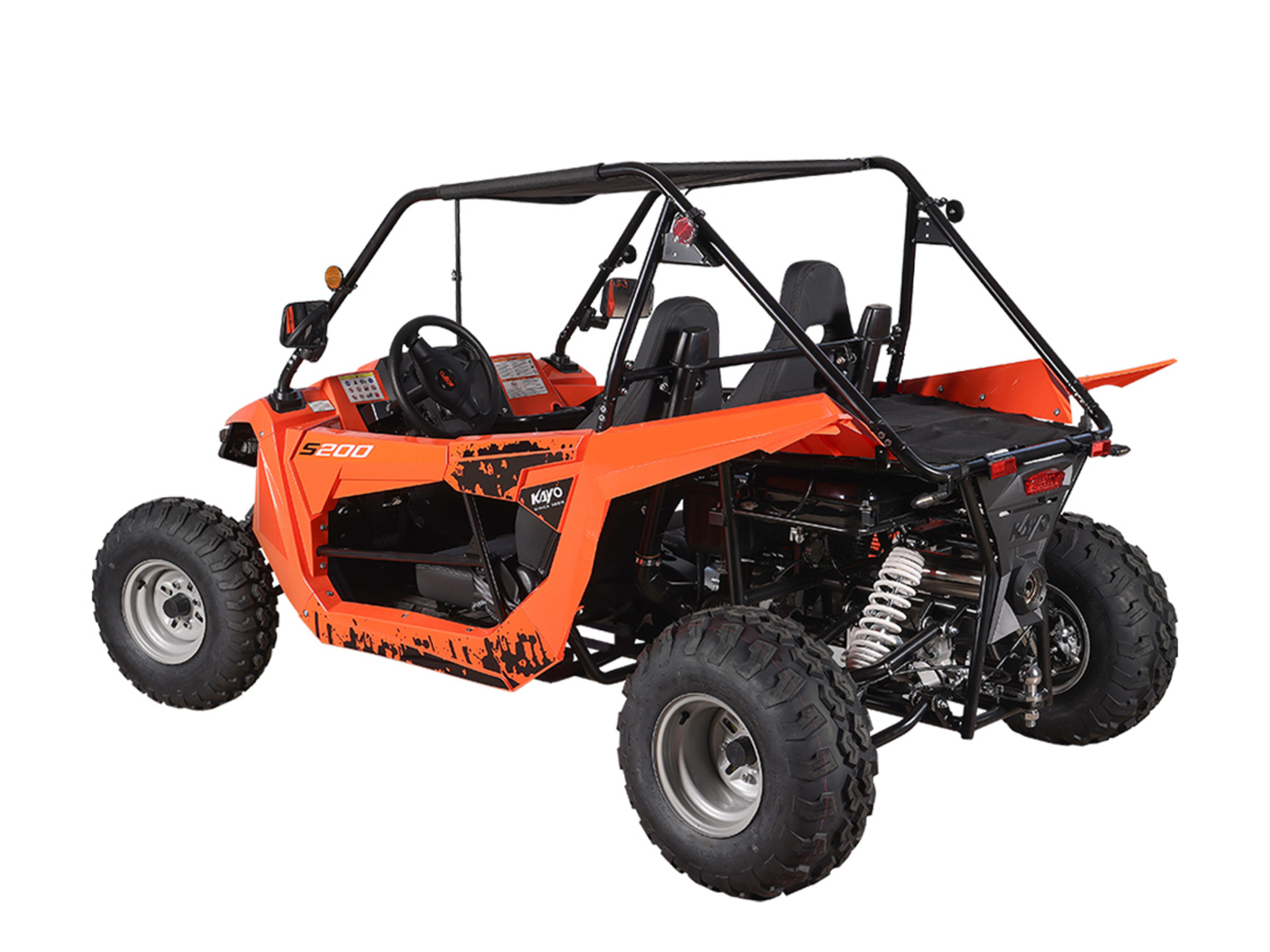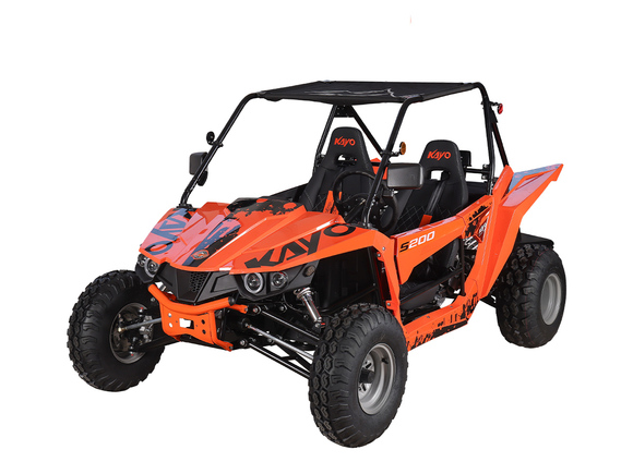 Квадрицикл KAYO S200 (2024 г.) (ПТС) – багги, который сочетает в себе мощность, манёвренность и прочность, что позволяет уверенно ездить по пересечённой местности. Своей способностью справляться с различными препятствиями и условиями, KAYO S200 открывает новые горизонты, делая каждую поездку незабываемой.Багги оснащён одноцилиндровым 4-тактным двигателем LONCIN LX163FML объёмом 196 см³ с электростартером и воздушно-масляным охлаждением. Цилиндр располагается вертикально. Степень сжатия 9.3:1. Двигатель развивает мощность 15 л.с. на 7000 об/мин, а максимальный крутящий момент в 15 Н·м достигается на 5500 об/мин. Передача крутящего момента на задние колёса осуществляется при помощи карданного привода. Максимальная скорость 65 км/ч.За подачу топлива отвечает карбюратор PZ30. Он обеспечивает бесперебойную работу в самых жёстких условиях, прост в обслуживании и неприхотлив к качеству топлива. Объёма бака в 15 литров хватает для длительных поездок. Трансмиссия – клиноременный вариатор с режимами F-N-R.Подвеска собственной разработки KAYO представлена в виде независимых нерегулируемых амортизаторов. Спереди используется подвеска на А-образных рычагах длиной 420 мм с ходом 130 мм. Задние амортизаторы имеет длину 480 мм и ход подвески 150 мм. Такая конструкция позволяет KAYO S200 адаптироваться к неровностям поверхности и обеспечивает плавное и комфортное вождение. Минимальный клиренс в 230 мм позволяет без труда преодолевать препятствия на различных ландшафтах. И даже склоны до 25˚ не станут для багги помехой.На квадрицикл установлены колёса диаметром 10 дюймов, с размерами шин спереди AT22*7.0-10 и сзади AT22*10-10. Покрышки выполнены из высококачественного компаунда и имеют агрессивный рисунок протектора. Они отлично держат дорогу на разных типах покрытий. Гидравлические дисковые тормоза обеспечивают эффективное и безопасное торможение. Ручной тормоз осуществляет фиксацию задней оси.Среди конструктивных особенностей необходимо отметить мощную раму оригинальной разработки, которая обеспечивает прочность и долговечность конструкции. Облицовка багги выполнена из прочного пластика, а крыша из износостойкого мягкого материала. Также имеется электронная приборная панель с информативным ЖК-экраном, обрезиненные рулевое колесо и рычаг ручного тормоза, которые позволят райдеру мгновенно реагировать на изменения дорожных условий и маневрировать в любых ситуациях. KAYO S200 идеально подходит для поездок за город в поисках приключений или для семейного отдыха.За безопасность пассажиров отвечают ремни безопасности с 4-точечной системой, которые застёгиваются посередине спереди. Дополнительно имеется ручка для пассажира, чтобы держаться при сильном наклоне или тряске.Багги имеет паспорт транспортного средства (ПТС) и всё необходимое снаряжение для использования на дорогах общего пользования: фары, сигнальные огни, зеркала заднего вида и звуковой сигнал.Габариты 2517x1487x1446 мм. Высота по седлу 410 мм. Вес 320 кг.