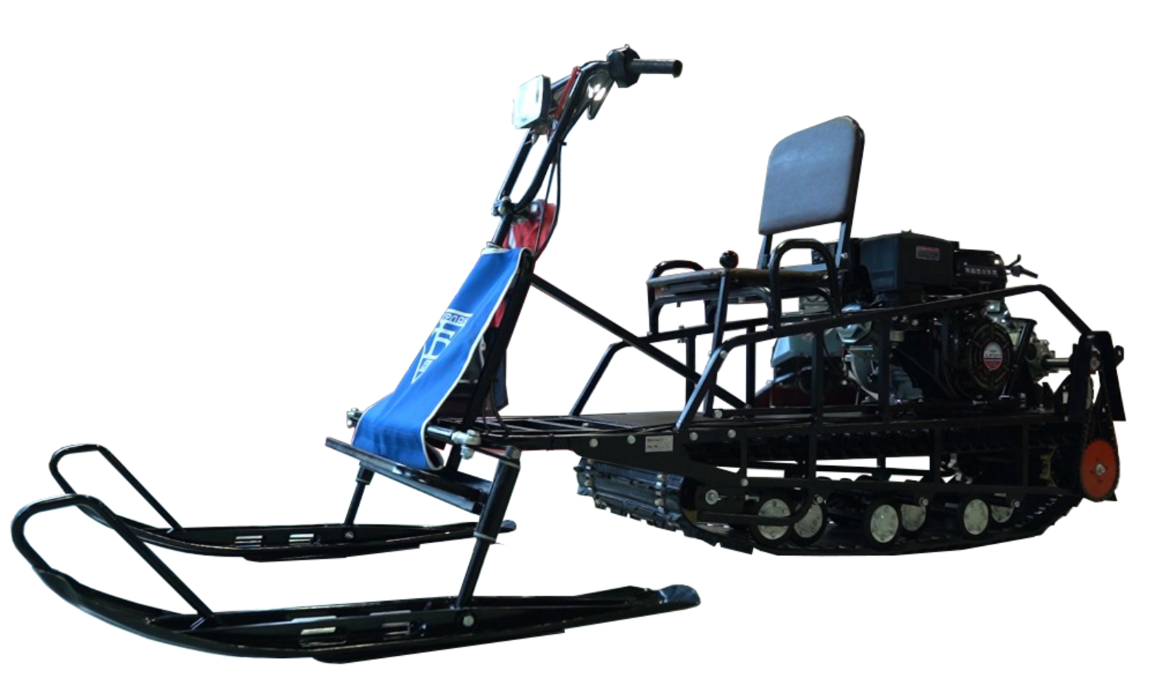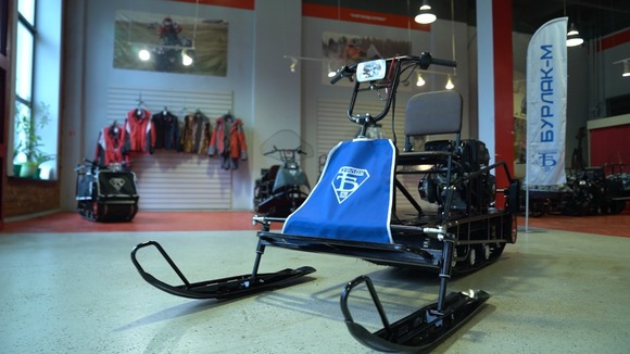 Установленный в базовой комплектации лыжный модуль с сиденьем превращает Бурлак-М Опти-R в доступный аналог миниснегохода.Модель собрана на классической базе длиной 1450 и шириной 510 мм, имеет катковую подвеску, комплектуется двигателем 15 л.с и трансмиссией вариаторного типа.На лыжном модуле установлены две лыжи от снегохода «Тайга». Галогеновая фара входит в базовую комплектацию.Дополнительно можно установить тормоз, реверс и съемный кофр.