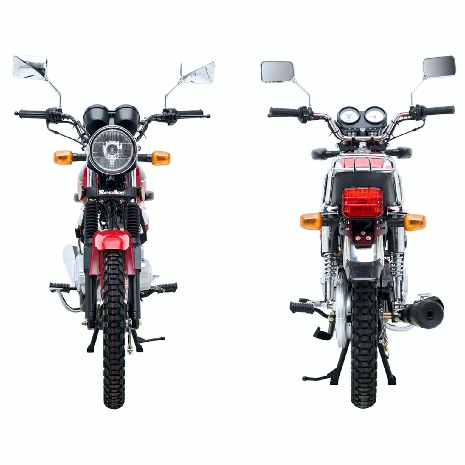 Комплектация Мотоцикл комплектуется всем необходимым оборудованием для комфортной и безопасной эксплуатации на городских и проселочных дорогах: приборная панель, зеркала, световое оборудование, электростартер (двигатель также можно завести при помощи кик-стартера), защитный кожух цепи, складные подножки пассажира и крепкий багажник. Тормоза барабанные.