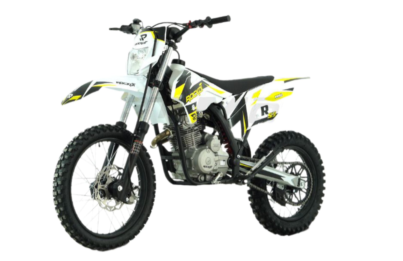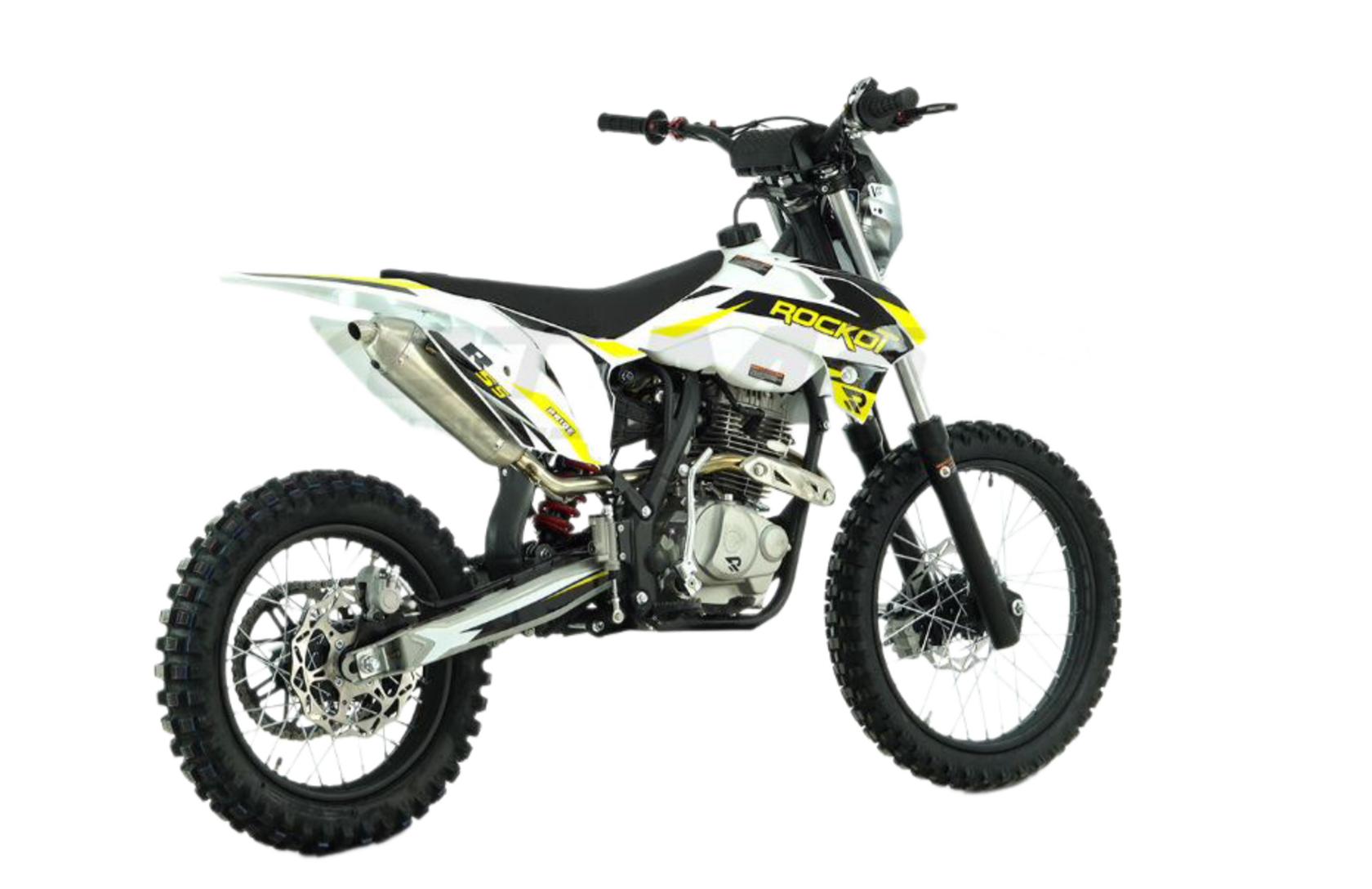 1ROCKOT R5S - эндуро мотоцикл начального уровня, который создан для новичков и подростков. Небольшая высота по седлу и короткая колесная база обеспечивают отличную управляемость и позволяют управлять мотоциклом людям, чей рост достигает 150 см. ROCKOT R5S построен на базе уже известных многим мотоциклов ROCKOT R5 Cyclone и R5F Raptor. ДизайнМотоциклы ROCKOT серии R имеют общую раму, пластик и концепцию дизайна. Различна между ними цветовая схема графики облицовочного пластика.Рама мотоцикла R5S окрашена в черный цвет. На белом облицовочном пластике нанесена прочная защитная пленка с графикой в белом черном и желтом цветах. Сам пластик выполнен в стиле КТМ 2015. Передние амортизаторы и обода колесных дисков, как и рама, окрашены в черный матовый цвет. ДвигательЭндуро мотоцикл ROCKOT R5S оснащен четырехтактным двигателем, объемом 144,6 см³ и мощностью 11,6 лошадиных сил. Система ГРМ 2-х клапанная с верхним распредвалом. Запуск двигателя может осуществляться как электростартером, так и кик-стартером. Коробка передач - пятиступенчатая с многодисковым сцеплением в масляной ванне. Двигатель очень отзывчиво откликается на ручку газа, но в то же время прощает ошибки, поэтому данная модель и будет идеальной для новичка. РамаROCKOT R5S построен на раме типа К5, ставшей очень известной благодаря мотоциклам ROCKOT R5 Cyclone и R5F Raptor. При том, что это мотоцикл с высотой по седлу равной питбайку, он имеет настоящую полноценную мотоциклетную раму из хром-молибденовой стали. Геометрия рамы идеально сбалансирована для эндуро и обеспечивает отличную управляемость на бездорожье. Подрамник также выполнен из стали. ПодвескаДанная модель построена на классической эндуро подвеске. Спереди установлена телескопическая вилка с толщиной перьев 37 мм, что является внушительным диаметром для классической вилки. Сзади установлен стальной маятник с моноамортизатором. Конструкция задней подвески - безлинковая, что упрощает обслуживание мотоцикла. Тормозная системаПолностью вся тормозная система мотоцикла - дисковая гидравлическая. Спереди и сзади установлены тормозные диски равного диаметра - 240 мм. Сзади установлен однопоршневой тормозной суппорт, спереди - двухпоршневой. КолесаВажная отличительная часть мотоцикла - колеса размерностью 19/16. Данное решение позволило сделать среднеразмерный эндуро мотоцикл идентичным по геометрии и управляемости полноразмерному эндуро, а также уменьшить высоту по седлу. Спереди установлена шина размерностью 80/100-19, сзади - 110/90-16 с внедорожным грязевым протектором.. Также, в отличие от других мотоциклов подобной компоновки, он приводится в движение цепью с 520 шагом, тогда как у других мотоциклов установлена цепь с шагом 428. Стальная приводная ведомая звезда на 47 зубьев обеспечивает высокий крутящий момент и позволяет заезжать на высокие подъемы с крутым уклоном. Кому подойдет эндуро мотоцикл ROCKOT R5SROCKOT R5S можно назвать промежуточной моделью между питбайком и полноценным мотоциклом. Колесная база мотоцикла - 1340 мм, а высота по седлу - 850 мм. Если вы задумываетесь, что вам подойдет больше, питбайк или мотоцикл - ROCKOT R5S для вас. Данная модель поможет райдеру понять принцип управления мотоциклом, научиться пользоваться мотоциклетной пятиступенчатой коробкой передач и почувствовать отличную управляемость, которая присуща только мотоциклам. Данную модель высоко оценя