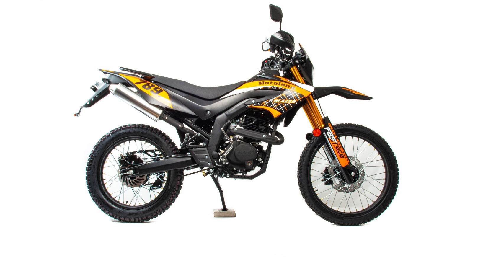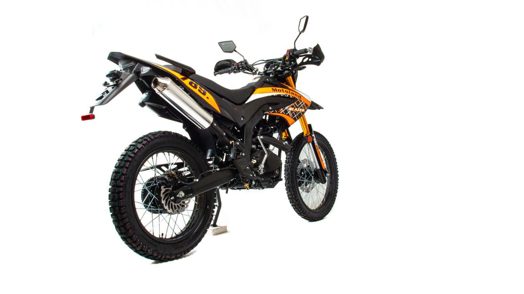 Motoland BLAZER 250 - отличный эндуро-мотоцикл по доступной цене. Двигатель 165FMM мощностью 16 л. с., усиленную «перевернутую» переднюю вилку, защиту двигателя и рук, LCD-панель, светодиодные поворотники и стоп-сигнал и кроссовую фару.Переднее колесо 2.75-21, заднее колесо 4.0-18.мотоцикл двойного назначения – для асфальта и легкого бездорожья.Наличие ПТС дает возможность легально передвигаться по городским улицам и дорогам общего пользования, внедорожные качества позволяет без особых усилий преодолевать бездорожье.Как видите, за довольно символическую цену вы получаете полноценный эндуро мотоцикл. После небольшой доработки мотоцикла, его свободно можно использовать для эндуро рейдов.Blazer 250 отлично подойдет как опытным любителям эндуро, так и начинающим.Мотоцикл маневренный и потрясающе удобный в городе, из за своей узкой и высокой формы, способный пролезть даже в минимальные зазоры между стоящими в пробке автомобилями. , внедорожные качества позволяет без усилий преодолевать грязь и трудопроходивые места .Максимальную скорость – 120 км/ч которой для города и неспешных прогулок за его пределы вполне достаточно..При этом он прост в управлении и неприхотлив в обслуживании и подходит мотолюбителям любого возраста,и опыта вождения.Мягкое сидение для 2-х пассажиров и подножки пассажира для удобных совместных поездок.Тихий городской глушитель, который не доставит вам дискомфорта.Скромный расход топлива, который почти не зависит от того, с какой скоростью едет мотоцикл и на каких оборотах работает двигатель, в среднем это 3,2-3,5 л на 100 км.Мотоцикл прост в управлении и неприхотлив в обслуживании. Подходит мотолюбителям Эндуро любого возраста и опыта вождения, которым нужна техника для поездок из точки А в точку Б и обратно по дорогам и легкому бездорожью.Технические характеристикиMotoland BLAZER 250 оснащен одноцилиндровым четырехтактным двигателем с воздушным охлаждением.Двигатель 172 FMM мощностью 21 л. с. и объемом 250 см³, ГРМ ЦепнойКарбюратор PZ 30 .Для запуска двигателя можно использовать электростартер или кикстартер.Механическая трансмиссия содержит 5 передач.Полудуплексная стальная рамаДополнительный бардачок для ключей Установлена 428 цепь Защита рукМотоцикл оснащен надежными передними и задними тормозами с двух и одно поршневыми тормозными суппортами соответственно.Колёса спицованные, размер заднего колеса — 18 дюймов, переднего — 21 дюймВесит 120 кг, выдерживает нагрузку до 150 кг.