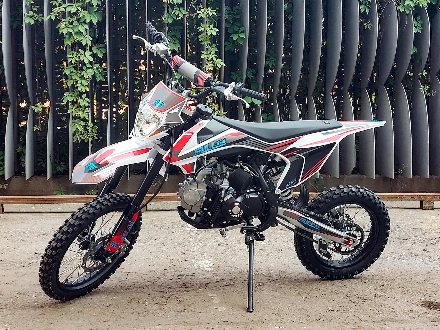 Питбайк Full Crew FC125e отлично подходит для пробующих мотоспорт – резвый мотор на 125 кубов с 9 лошадиными силами прекрасно работает с механической коробкой. Охлаждение воздушное – простая конструкция облегчает ремонт и удешевляет обслуживание. Для начинающих эта модель особенно интересна еще и из-за цены – можно основам научиться на нем с перспективой пересесть в дальнейшем на что-то более серьезное.Рама стальная усиленная, конструкция обеспечивает высокую удобную посадку, а подвеска (передняя перевернутая вилка и задний моноамортизатор) обеспечивает мягкое движение по кочкам, оврагам, деревьям и прочим всевозможным преградам на дикой трассе. Гидравлические тормоза работают надежно и четко.Из дополнительных приятных «плюшек»:- рычаги сцепления и тормоза откидываются;