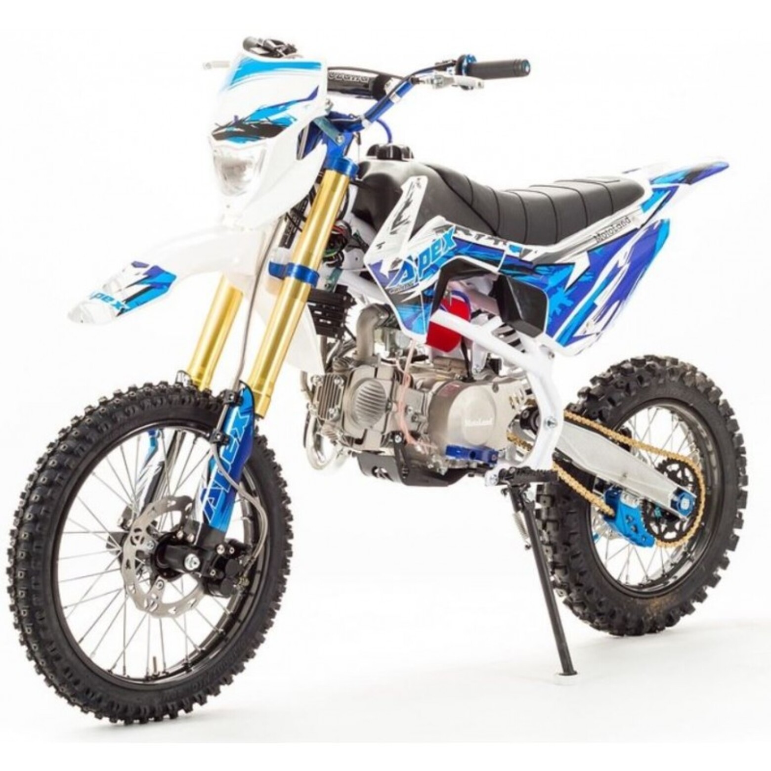 Недорогой надёжный питбайк APEX14 идеален для поездок по грунтовым дорогам и бездорожью. Хорошо чувствует себя на мягком и среднем грунте, разгоняется до 100 км/ч. Оснащён CNC траверсами, фарой, весит всего 70 кг. Питбайк прост в управлении и не требует специального ухода, подойдёт как новичкам, так и любителям мотокросса. У кроссового мотоцикла APEX14 отличный узнаваемый дизайн. Конструкция подчёркивает неуступчивый спортивный характер питбайка, который не остановится ни перед одним препятствием. Пластик комбинированный, прочный, не ломается при сгибании. Кроссовый мотоцикл APEX14 доступен в красном и синем цвете, при этом в основной цвет окрашен не только пластик, но и обода колёс и другие детали питбайка. Передняя подвеска — телескопическая нерегулируемая вилка перевёрнутого типа, которая отлично подходит для преодоления ям, ухабов и других неровностей плохих дорог или их отсутствия. Задняя подвеска маятниковая с моноамортизатором. Руль 22 мм с высоким подъёмом и перекладиной удобен для мотоциклистов разного роста. Ручки руля — комфортные PRO TAPER. Питбайк оснащён складными рычагами сцепления и переднего тормоза, а также CNC-лапкой переключения передач. Питбайк весит всего 70 кг, при этом выдерживает вес до 150 кг. Оснащён CNC траверсами, рама полудуплексная стальная, мотоцепь качественная. Колёса спицованные, сделаны из прочного и лёгкого алюминия. Размер заднего колеса — 14 дюймов (350 мм), переднего — 17 дюйм (430 мм). Тормоза дисковые, передний тормозной суппорт двухпоршневой, задний — однопоршневой. Питбайк оснащён карбюратором с фильтром нулевого сопротивления VM26 MIKUNI и одноцилиндровым четырёхтактным двигателем с воздушным охлаждением. Надёжный мотор мощностью 11 л. с. и объемом 140см³ разгоняет кроссовый мотоцикл APEX14 до 100 км/ч. Коробка передач механическая, четырёхступенчатая. Система зажигания электронная (CDI), для запуска двигателя можно использовать кикстартер. Покрышки с шипами и высоким грунтозацепом идеальны для бездорожья. Мощность мотора и небольшой вес питбайка позволяют ему преодолевать значительные препятствия и непролазную грязь, хорошо заходить в подъёмы. Также в комплекте есть щиток для номера, который ставится вместо фары. Питбайк 140 относится к недорогим моделям, которые при должной эксплуатации работают без сбоев и капризов. Кросс неприхотлив в обслуживании, не занимает много места в гараже. При необходимости в нём легко сменить любую повреждённую деталь.У нас Вы можете купить этот питбайк с бесплатной доставкой по РФ и гарантией до года. Также его можно приобрести в рассрочку или в кредит.