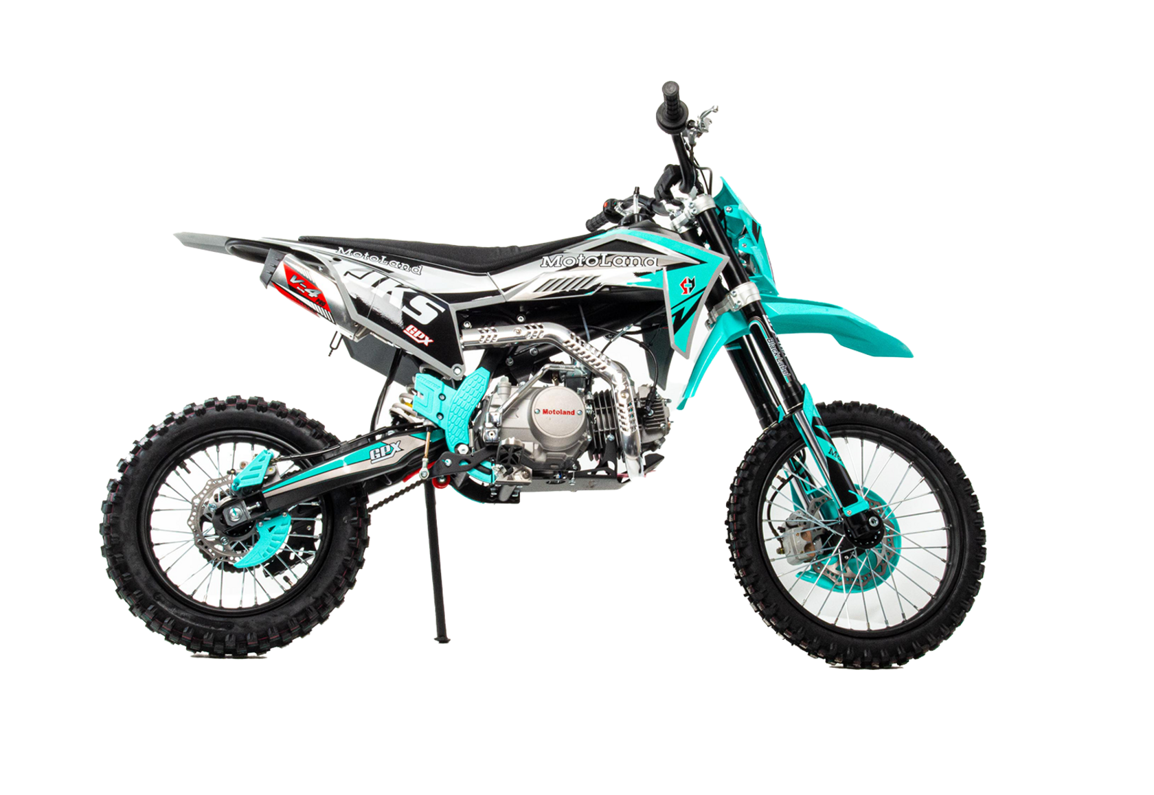 Питбайк MotoLand JKS 140 идеален для поездок по грунтовым дорогам и бездорожью. Хорошо чувствует себя на мягком и среднем грунте, разгоняется до 90 км/ч. Оснащён CNC траверсами, фарой, алюминиевыми ободами, весит всего 75 кг. Питбайк прост в управлении и не требует специального ухода, подойдёт как новичкам, так и любителям мотокросса.У кроссового мотоцикла мотоленд JKS 140 отличный узнаваемый дизайн. Конструкция подчёркивает неуступчивый спортивный характер питбайка, который не остановится ни перед одним препятствием. Пластик комбинированный, прочный, не ломается при сгибании. Передняя подвеска — телескопическая нерегулируемая вилка перевёрнутого типа, которая отлично подходит для преодоления ям, ухабов и других неровностей плохих дорог или их отсутствия. Задняя подвеска маятниковая с моноамортизатором. Питбайк оснащён складными рычагами сцепления и переднего тормоза, а также CNC-лапкой переключения передач.Колёса спицованные, сделаны из прочного и лёгкого алюминия. Размер заднего колеса — 14 дюймов (350 мм), переднего — 17 дюйм (430 мм). Тормоза дисковые, передний тормозной суппорт двухпоршневой, задний — однопоршневой.Питбайк оснащён карбюратором с фильтром нулевого сопротивления MIKUNI VM22 и одноцилиндровым четырёхтактным двигателем с воздушным охлаждением. Надёжный мотор мощностью 11,1 л. с. и объемом 140 см³ разгоняет кроссовый мотоцикл мотоленд Апекс 140 до 90 км/ч. Коробка передач механическая, четырёхступенчатая. Система зажигания электронная (CDI), для запуска двигателя использовать кикстартер.Сверхпроходимость.Покрышки с шипами и высоким грунтозацепом идеальны для бездорожья. Мощность мотора и небольшой вес питбайка позволяют ему преодолевать значительные препятствия и непролазную грязь, хорошо заходить в подъёмы.Для поездок при низкой видимости и в ночное время суток питбайк JKS 140 оснащён фарой, которая включается при повороте замка зажигания (1 – выключить, 2 – включить, 3 – свет).Питбайк относится к недорогим моделям, которые при должной эксплуатации работают без сбоев и капризов. Кросс неприхотлив в обслуживании, не занимает много места в гараже. При необходимости в нём легко сменить любую повреждённую деталь.