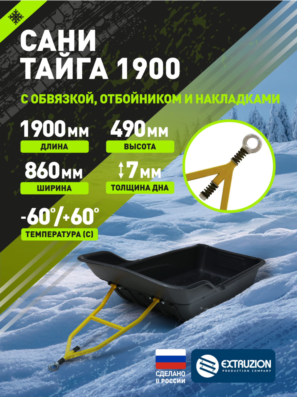 Преимущества конструкции. Узкое дно шириной 550 мм обеспечивает отличную проходимость по глубокому снегу Сбалансированная геометрия корпуса гарантирует устойчивость на сложном рельефе Увеличенная высота бортов 490 мм позволяет перевозить высокие грузы Накладные полозья увеличивают срок службы и значительно улучшают скольжение в любых условиях