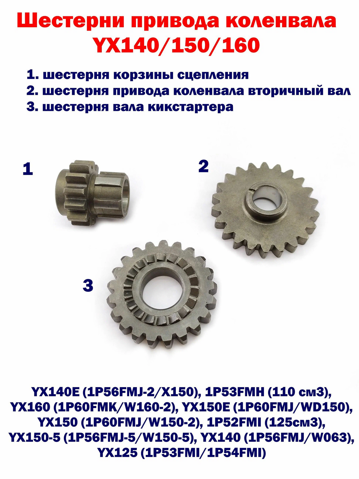 Шестерни привода коленвала и кикстартера комплект YX140/ YX150(150-5/ 150-2) /YX160