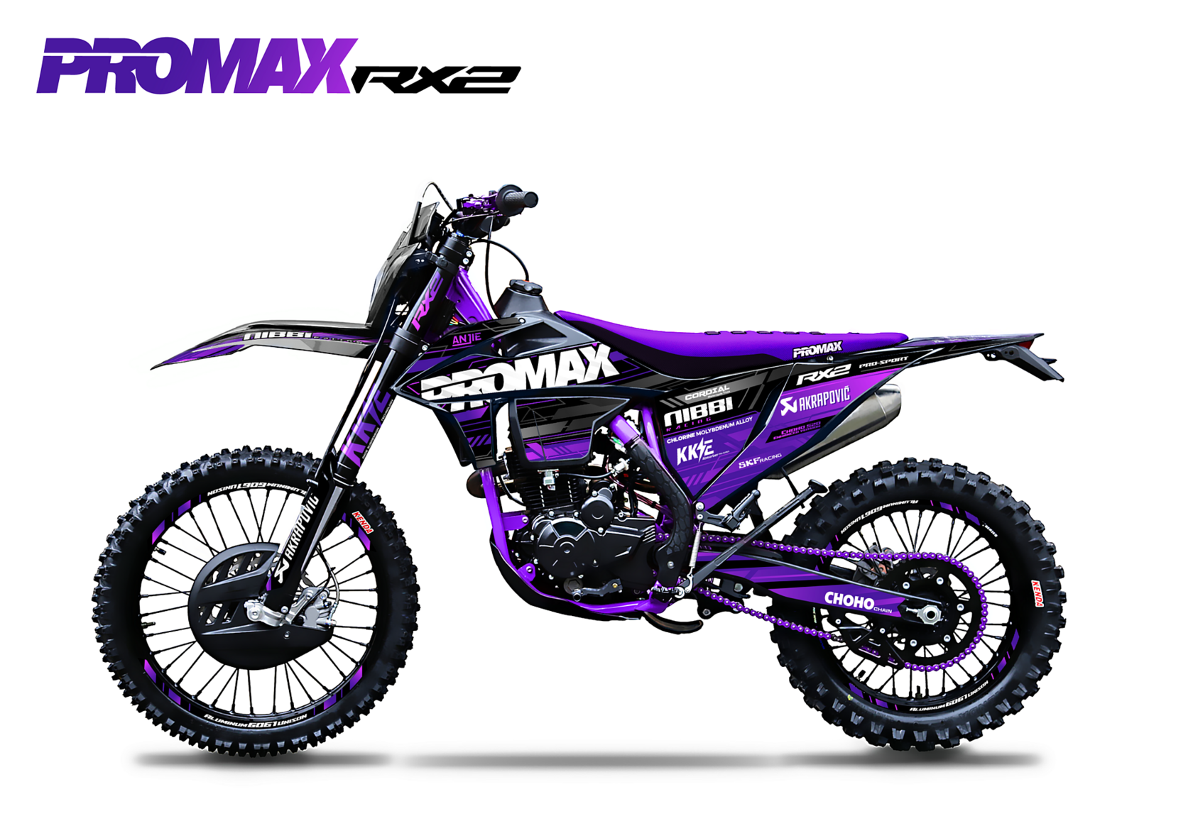 Новинка с новейшим ДВС YB300H (LX176FMN) (4 valves, 6 gears) в комбинации с профессиональным карбюратором NIBBi PWK 34 SPORT-SERIES выдает 32 лошадиные силы! Идеально сбалансированный двигатель с наименьшим коэффициентом вибрации с максимальным крутящим моментом удивит даже искушенных райдеров!PROMAX – гарантия оригинального товара Тайванского бренда, с высоким качеством техники, подтвержденным ТРЕХЛЕТНЕЙ гарантией! Бренд известен по всему миру за его надёжность и соответствие мировым стандартам!Кроссовый мотоцикл PROMAXRX2 YB300H (LX176FMN) – заряжен на максимум! Большой бак, профессиональные комплектующие – это все для ваших МАКСИМАЛЬНЫХ результатов!Рама и двигатель300 кубов YB300H – мотор, обладающий потрясающей тягой на низах и стабильной работой на верхах. Компоновка мотора позволяет «снять» 32 лошадиных сил, чего достаточно даже для соревнований! Питается мотор от карбюратора NIBBI RACING BLACK PWK-34 SPORT-SERIES – ТОПовое решение для такой техники, к которому стремятся все производители. Топливный бак на 11 литров - покатушки закончатся не скоро! Все это установлено на раму проекта K8, выполненную из хромолибденовой стали и покрытой RAPTOR’ом – высокая прочность, легкий вес и колоссальный срок службы выводят данное сочетание в лидеры запросов по всему миру!Подвеска и колёсаРегулируемая подвеска KKE это всем известная проверенная подвеска, которая используется такими именитыми брендами как KTM, HONDA, YAMAHA и многими другими! Подвеска с широким диапазоном настроек гарантирует контроль над мотоциклом в любых дорожных условиях.Алюминиевые диски UNISON со спицами толщиной 4мм, «обутые» в KENDA PROF обеспечивают необходимое сцепление даже в самых «грязных» условиях!Цепь и звёздыПриводная цепь Усиленная RK520 CHOHO TOP-SERIES – правильный выбор. Цепи производителя CHOHO завоевали рынок своим качеством и надежностью! Биметаллические звезды привода имеют огромный запас прочности – в такой связке замена приводных элементов наступит не скоро!Руль и сиденьеАлюминиевый руль IGP 7075 FATBAR оборудован короткоходной ручкой газа от NIBBI Racing и грипсами на замке, исключающими проскальзывание и сползание грипсы. Подушка безопасности на руле – неотъемлемая часть. Курки сцепления и тормоза – неломайки из фрезерованного алюминия от бренда NIBBI Racing! Элементы управления максимально прочные и легкие для достижения баланса мощности и веса! Сидень с противоскользящим покрытием удержит на себе райдера в критических ситуациях!Электроника и освещениеФара головного света – светодиодная, линзованная, с ярким световым потоком! Можно кататься не только днём! Для повышения безопасности в темное время суток предусмотрен задний габарит! Приборная панель с отображением информации о текущем состоянии стала уже классикой и данный мотоцикл не стал исключением – тут она есть. Влагозащищённые соединительные разъёмы электрической цепи – гарантия стабильной работы при эксплуатаций в различных условиях!