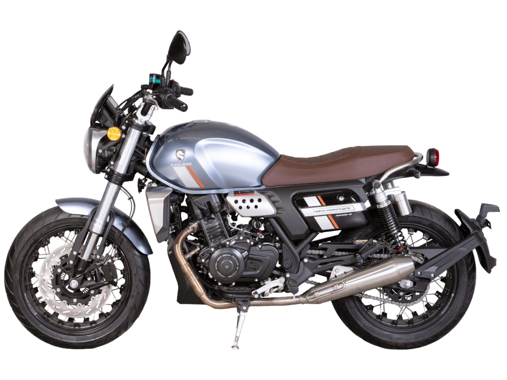 CYCLONE RE401 (SR400-B) 2024 – классик, в котором подчёркнутая простота объединяется с современными технологиями. Данная модель является более продвинутой версией модели RE3 (SR-400) – мотоцикл обладает более современным дизайном, снабжён стильными металлическими накладками на радиатор, а также топливным баком, объём которого увеличен до 20 литров.Двухцилиндровый четырёхтактный двигатель объёмом 401 см3 выдаёт 43 л.с. на 9500 об/мин. Инжекторный впрыск топлива с инжектором BOSCH увеличивает топливную экономичность, а также позволяет добиться высокой приёмистости и неприхотливости агрегата. Жидкостная система охлаждения не допустит перегрева двигателя даже при самом агрессивном вождении. На мотоцикл установлена 6-ступенчатая механическая коробка передач.Максимальная скорость мотоцикла составляет 150 км/ч.RE401 оснащён классическими спицованными колёсами диаметром 17 дюймов. Колёса обуты в бескамерные покрышки TIMSUN. С неровностями дороги эффективно справляются телескопическая вилка перевёрнутого типа спереди и маятник с двумя амортизаторами сзади. Ход передней подвески составляет 130 мм, задней – 81 мм. Оба компонента подвески являются регулируемыми. Эффективное и безопасное замедление с любых скоростей обеспечивают гидравлические дисковые тормоза с ABS спереди и сзади.Клиренс мотоцикла составляет 170 мм. Объём топливного бака – 20 л. Снаряжённая масса – 186 кг.Из дополнительного оборудования можно выделить USB-порт и датчики давления в шинах.Мотоцикл сочетает в себе отличные технические характеристики, комфорт и надёжность, что позволяет вам ощутить настоящую свободу на любой дороге.